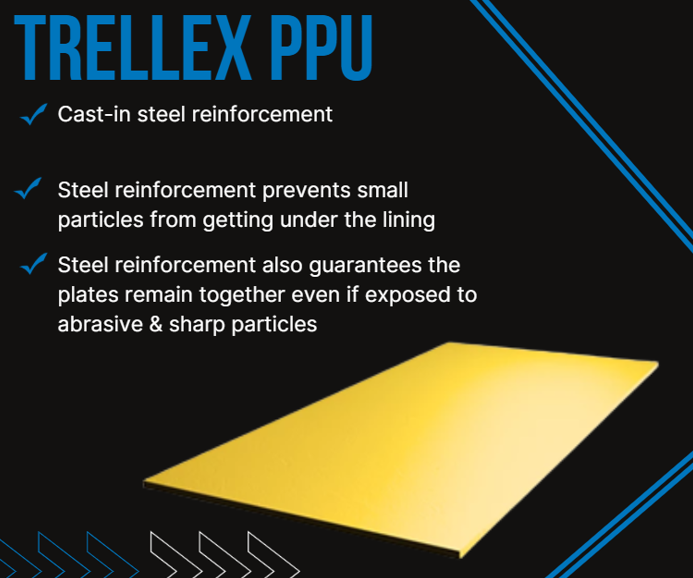 The Trellex PPU wear plates combine a robust polyurethane wear surface with a cast-in steel backing. This hybrid construction prevents small particles from migrating beneath the lining, ensures secure retention under abrasive stress, and helps keep the lining intact.